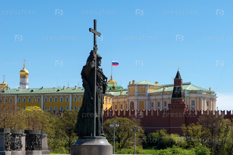 Москва, Россия - 10 мая 2021 г.: Памятник Святому равноапостольному князю Владимиру Святославичу, Крестителю Руси, установлен на Манежной улице, у стен Московского Кремля