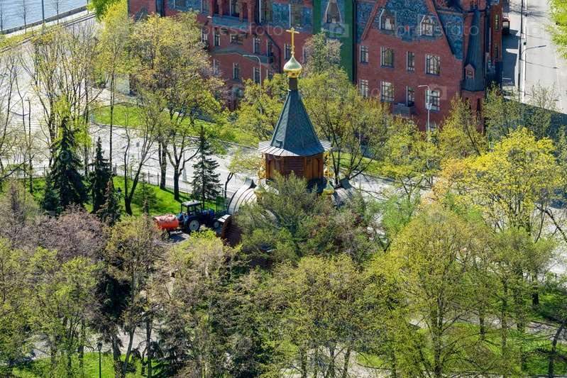 Вид сверху на храм церкви-часовни во имя иконы «Державная Божия Матерь» в Соймоновском проезде г. Москвы