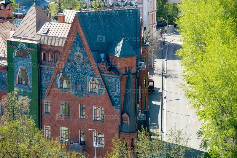 Москва, Россия - 10 мая 2021 г.: Вид сверху на многоквартирный дом Перцовой (1907 г.). Неорусское здание на углу Соймоновского проезда и Пречистенской набережной в Москве