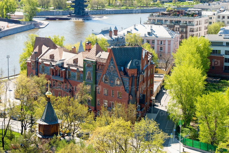 Москва, Россия - 10 мая 2021 г.: Вид сверху на многоквартирный дом Перцовой (1907 г.). Неорусское здание на углу Соймоновского проезда и Пречистенской набережной в Москве