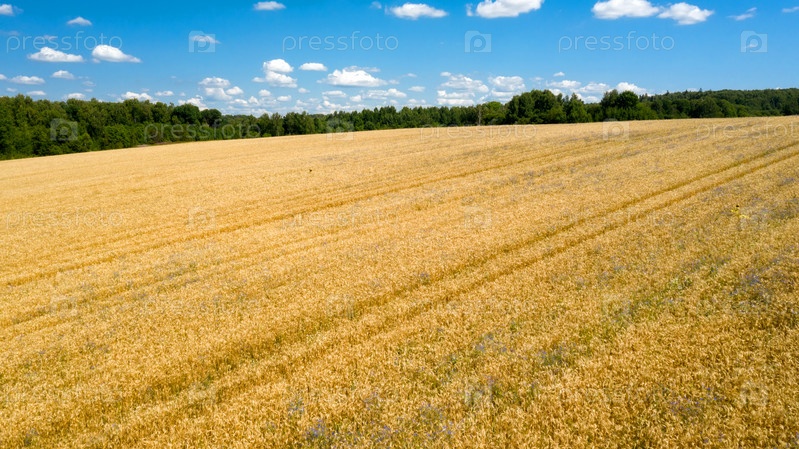 Живописный вид на сельскохозяйственное поле с зерновыми на летней ферме. Аэрофотосъемка, вид сверху с дрона. Сельскохозяйственный район Московской области. Аграрная земля в летнее время. Красота земли