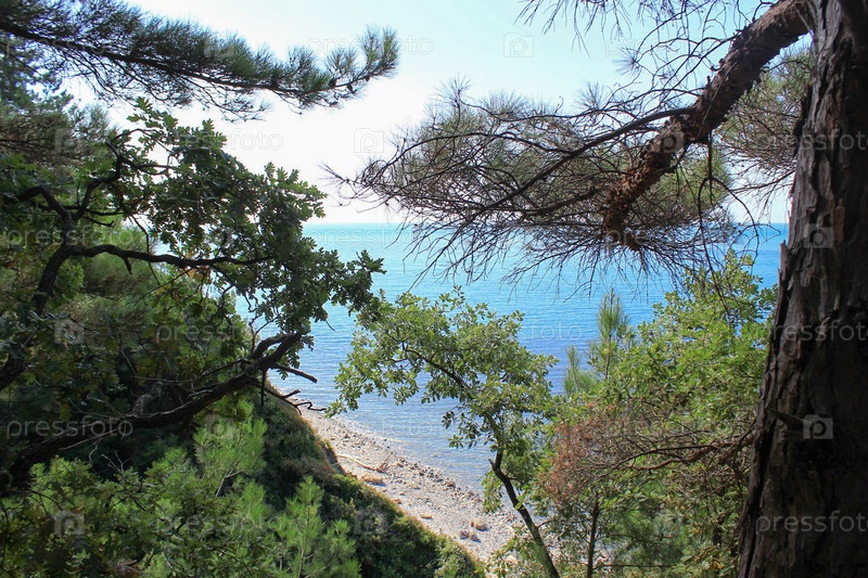 Вид на море среди сосновых ветвей, sea view among pine branches