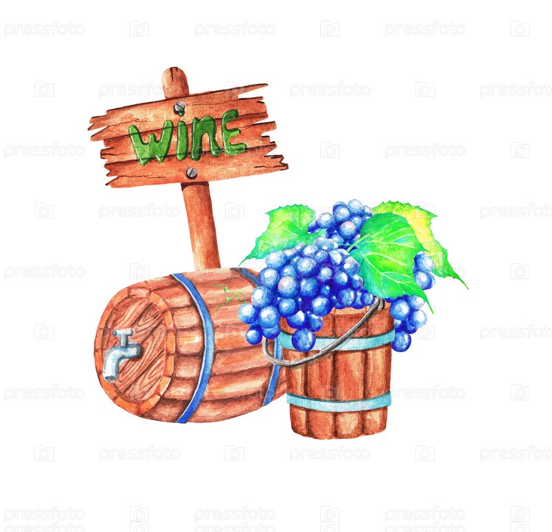 Ведро винограда, вывеска и винная бочка. Акварель (2)