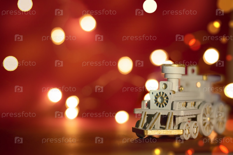 Белый рождественский локомотив на красном фоне с боке и расфокусированными огнями. Свободное место. Скопируйте пространство. Фон