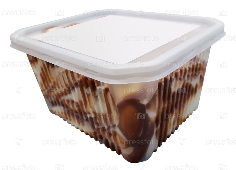 Карамельное мороженое в пластиковой коробке на белом фоне