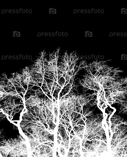 Силуэт голых деревьев, белые переплетенные ветви, изолированные на черном фоне