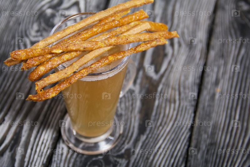 Тонкие сосиски к пиву. Они лежат на стакане пшеничного пива. Фон из сосновых досок. Крупный план