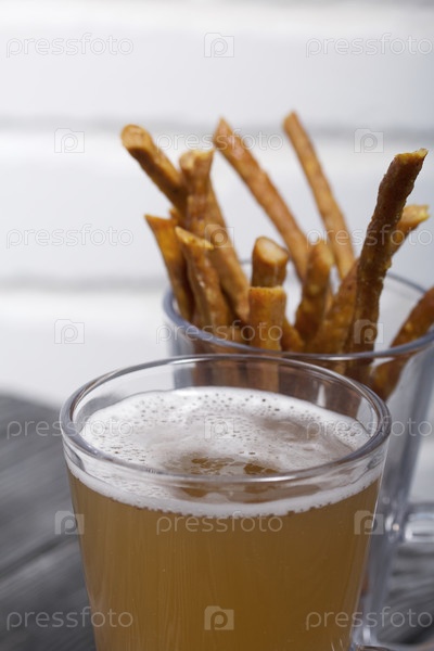 Тонкие сосиски для пива в пивном стакане. Рядом с ним стакан пшеничного пива. Фон из сосновых досок. Крупный план