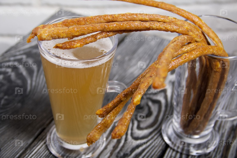 Тонкие сосиски для пива в пивном стакане. Рядом с ним стакан пшеничного пива. Фон из сосновых досок. Крупный план