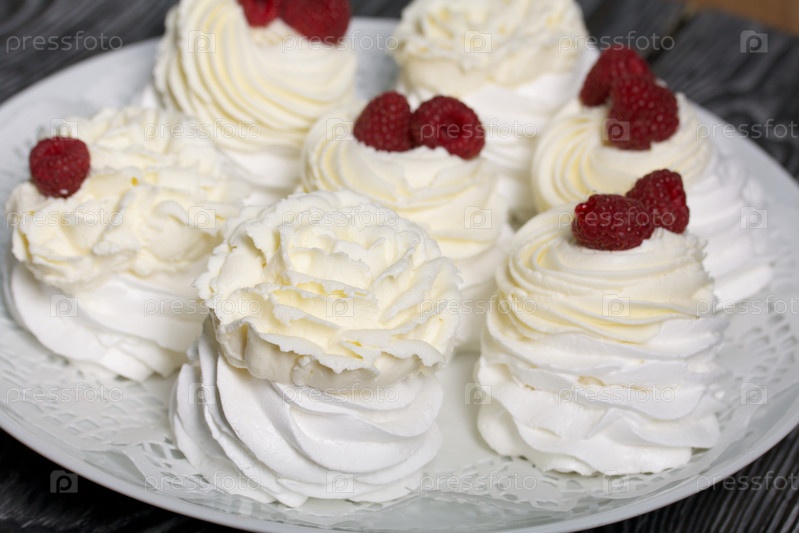 Торт Анна Павлова, безе и крем. Украшается малиной. Лежит на блюде, крупный план
