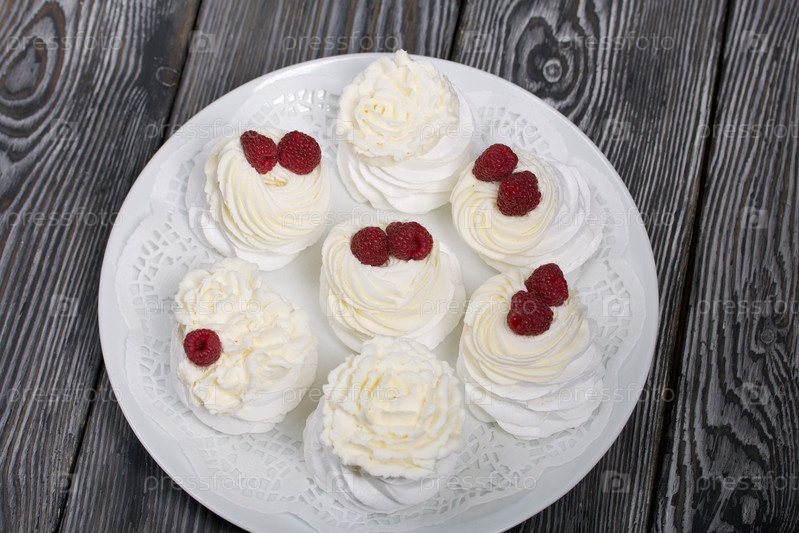 Торт Анна Павлова, безе и крем. Украшается малиной. Лежит на блюде, крупный план