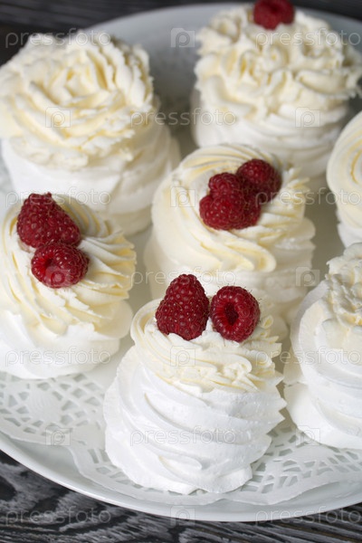 Торт Анна Павлова, безе и крем. Украшается малиной. Лежит на блюде, крупный план