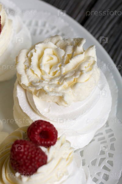 Торт Анна Павлова, безе и крем. Украшается малиной. Лежит на блюде, крупный план