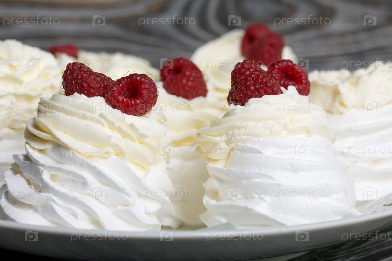 Торт Анна Павлова, безе и крем. Украшается малиной. Лежит на блюде, крупный план