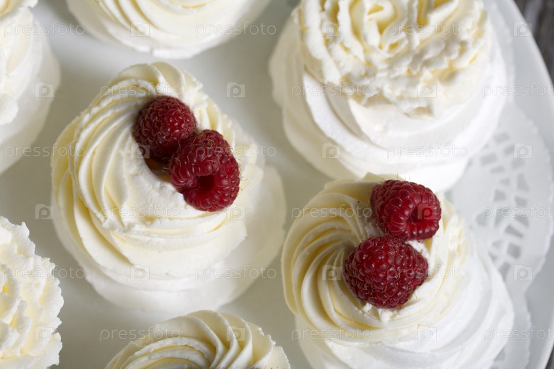 Торт Анна Павлова, безе и крем. Украшается малиной. Лежит на блюде, крупный план