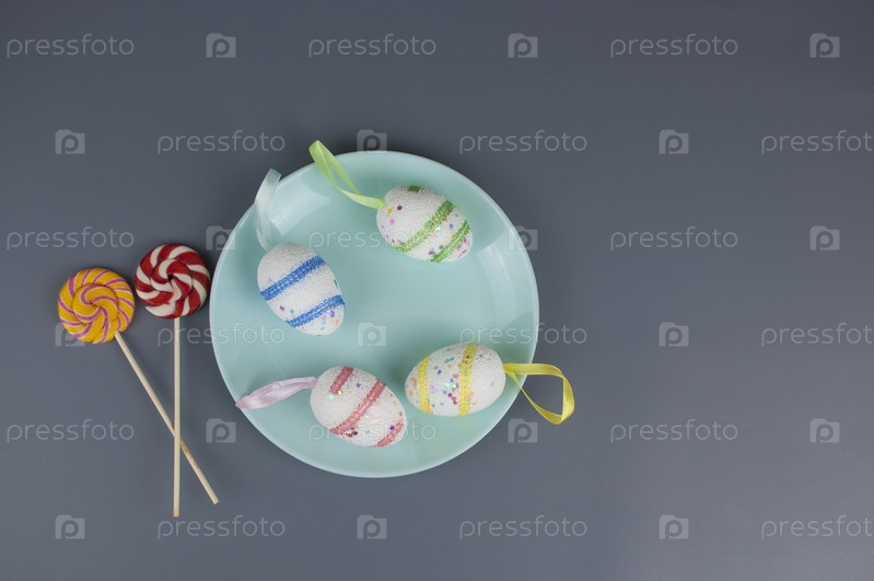 Красочные пасхальные яйца на керамической круглой тарелке с красочной салфеткой. Вид сверху, сверху с копией пространства