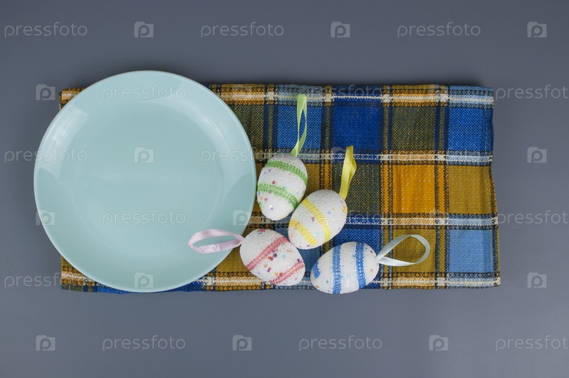 Красочные пасхальные яйца на керамической круглой тарелке с красочной салфеткой. Вид сверху, сверху с копией пространства