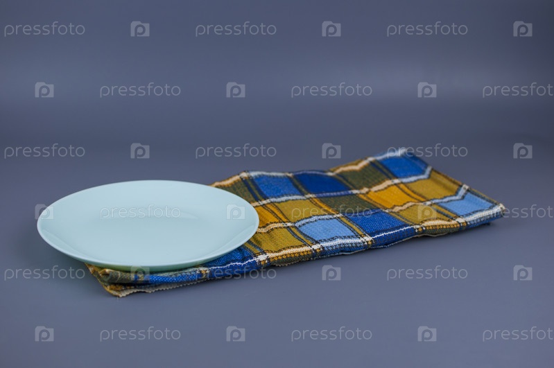 Пустая керамическая тарелка и полотенце на сером фоне