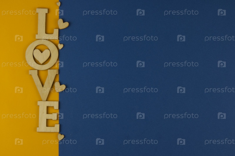 Любовное слово, маленькие сердца на фоне красочной бумаги. Вид сверху на День святого Валентина