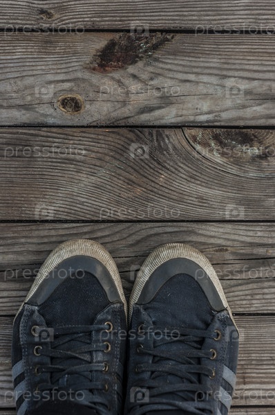 Синие кроссовки, стоящие на деревянном полу. Вид сверху