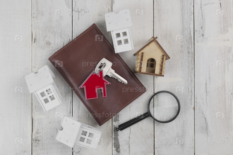 Металлический брелок в форме дома с металлическим ключом под увеличительным стеклом на фоне белой деревянной доски. Концепция недвижимости