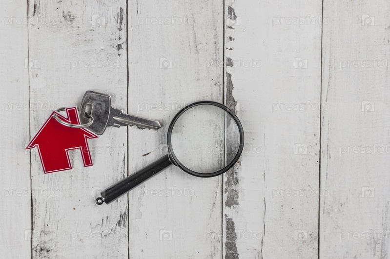 Металлический брелок в форме дома с металлическим ключом под увеличительным стеклом на фоне белой деревянной доски. Концепция недвижимости
