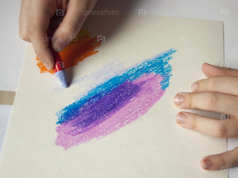 Рука ребенка держит красочную масляную пастель на белой бумаге