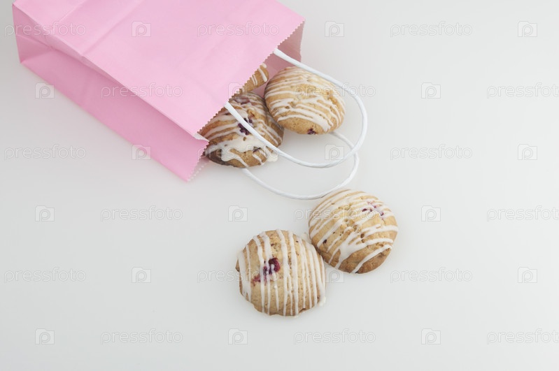 Печенье глазированное в розовой корзине на белом фоне. Концепция копировального пространства