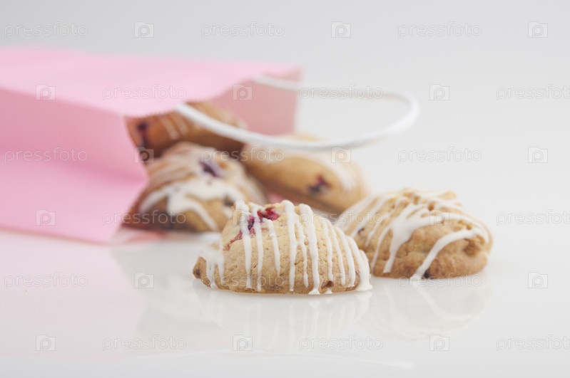 Печенье глазированное в розовой корзине на белом фоне. Концепция копировального пространства