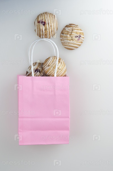 Печенье глазированное в розовой корзине на белом фоне. Концепция копировального пространства