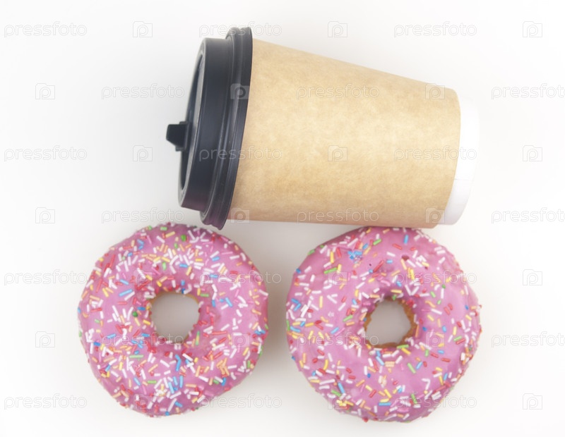 Вкусные пончики с одноразовой чашкой кофе на белом фоне
