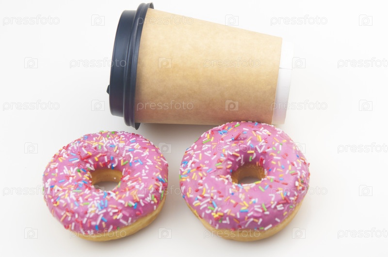 Вкусные пончики с одноразовой чашкой кофе на белом фоне