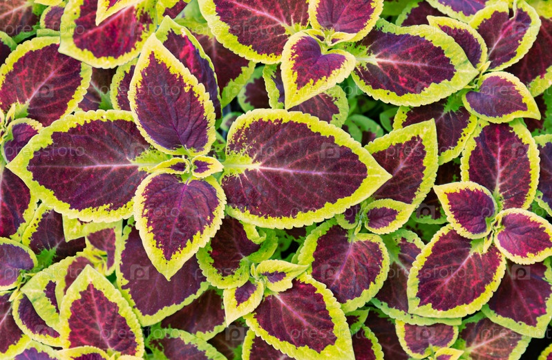 Coleus Blume красное растение с желтыми краями. текстура листьев в крупном плане на клумбе, вид сверху