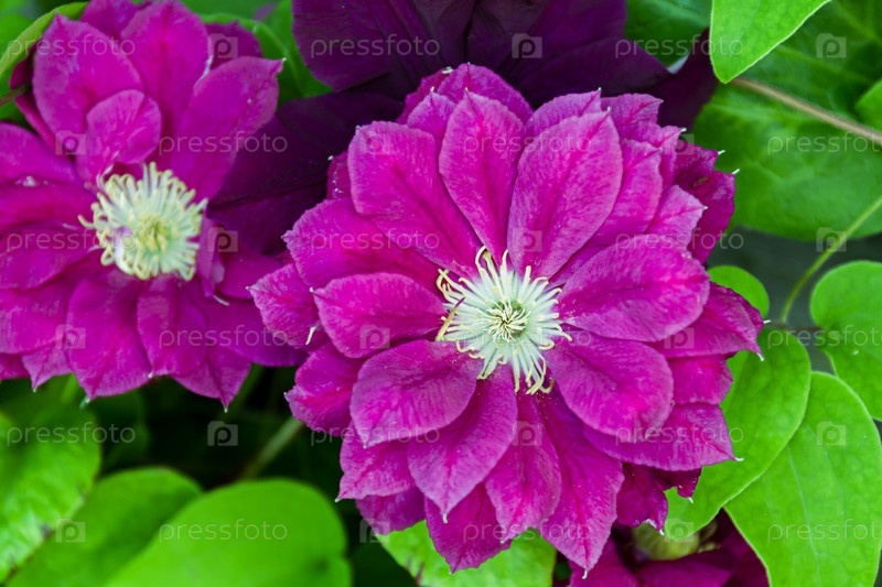 Красивый фиолетовый цветок клематиса с листьями. крупным планом