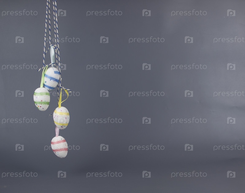 Украшение дома к Пасхе. Яркие пасхальные яйца висят на веревочках на сером фоне, копируют пространство