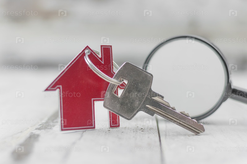 Металлический брелок в форме дома с металлическим ключом под увеличительным стеклом на фоне белой деревянной доски. Концепция недвижимости