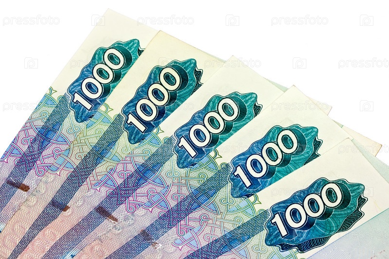 Пять купюр достоинством в одну тысячу рублей