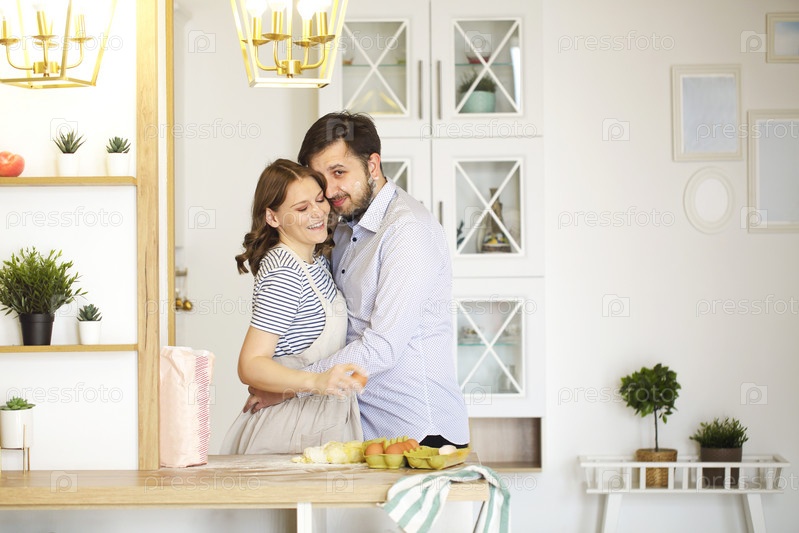 Вид сбоку на восхищенную влюбленную пару, обнимающуюся на кухне во время совместного приготовления пищи