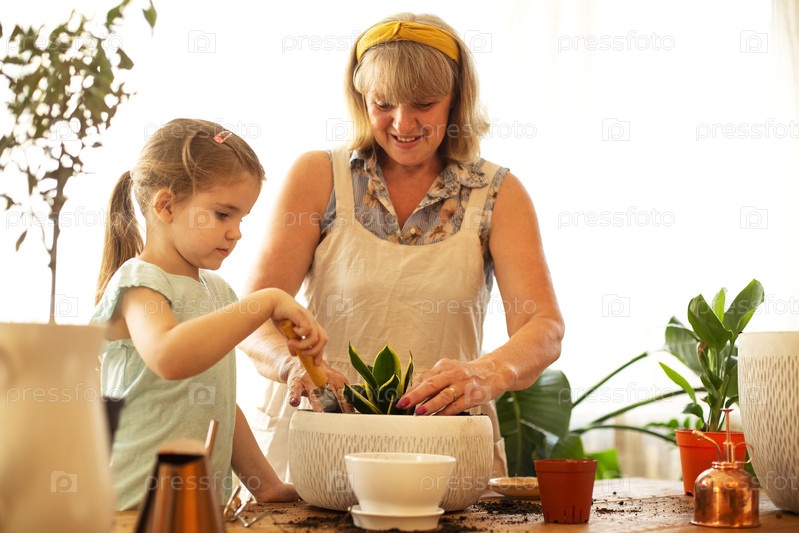 Маленькая девочка помогает бабушке ухаживать за комнатными растениями, работая вместе в домашнем саду