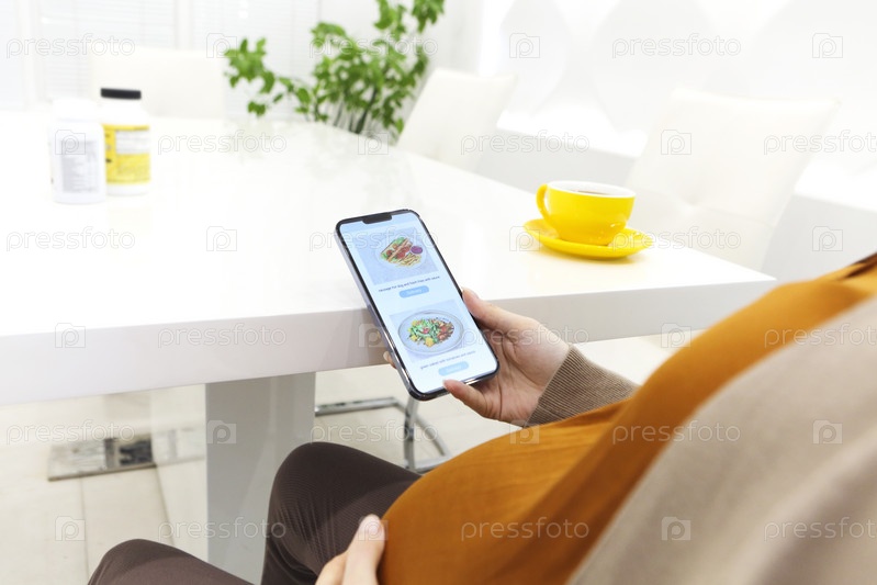Беременная женщина держит смартфон с помощью приложения для отслеживания беременности на мобильном телефоне, сидя в помещении