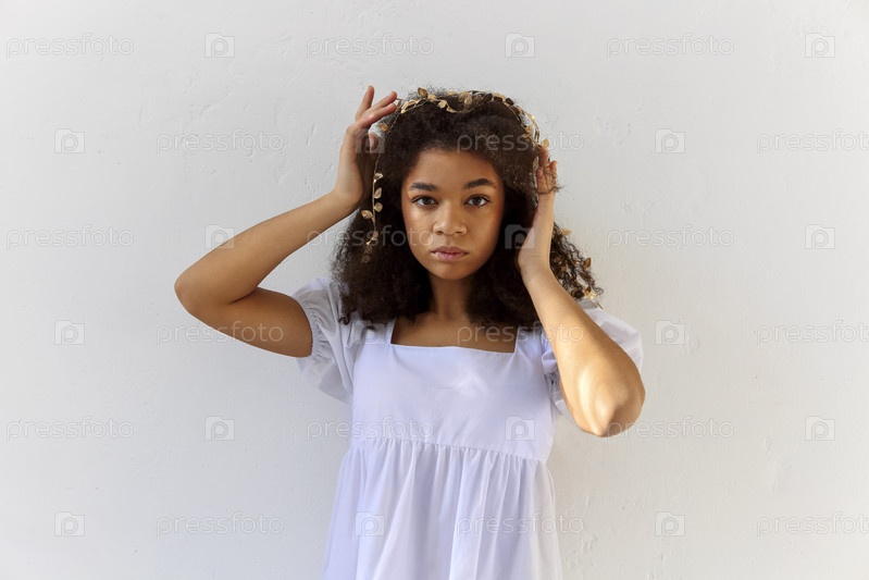 Симпатичная симпатичная афроамериканка с вьющимися волосами в повязке на голове из сусального золота, изолированная на белом