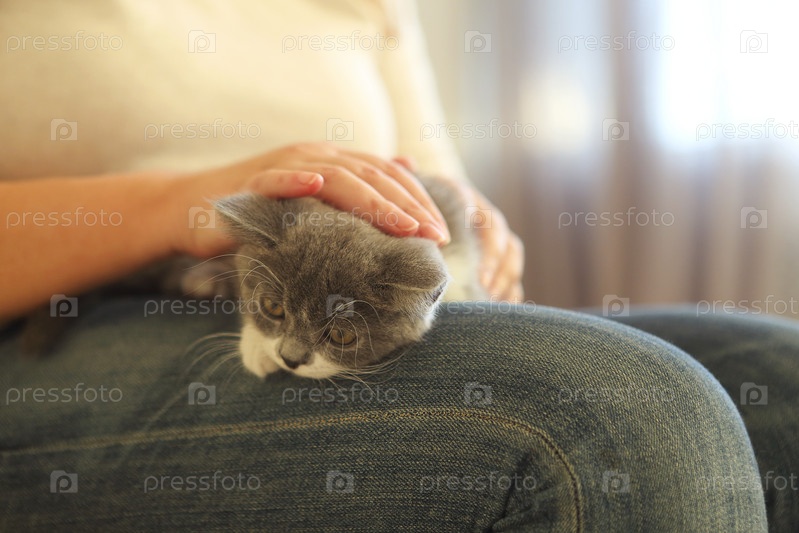 Симпатичный серый и белый котенок сидит на коленях у женщины
