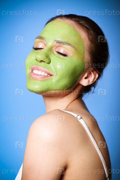 Веселая женщина надевает зеленую маску