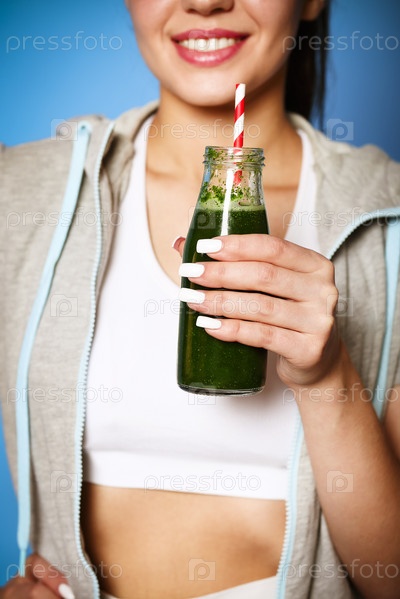 Восхищенная женщина с зеленым смузи смеется на фоне стены