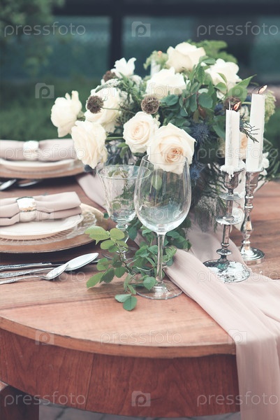 Свечи и ваза с белыми розами на круглом столе возле бокалов