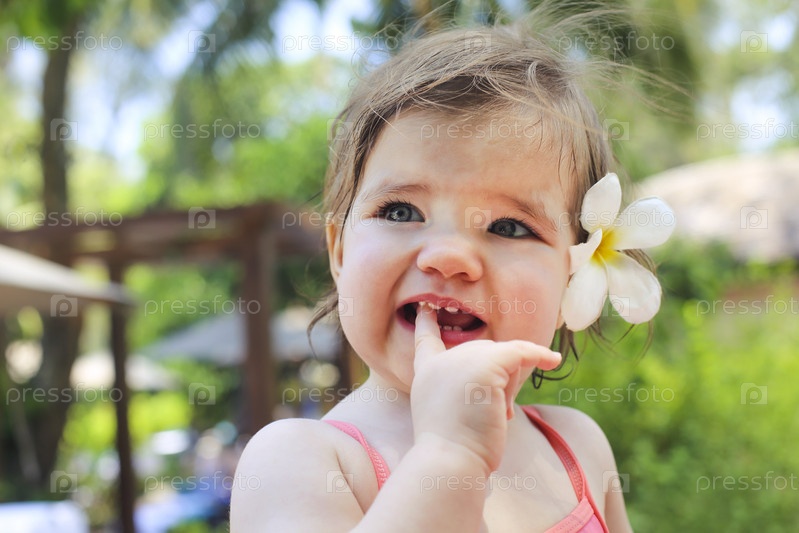 Портрет очаровательной маленькой девочки с цветком на летних каникулах на пляже