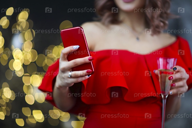 Счастливая девушка в красном платье с телефоном и бокалом шампанского на красивых рождественских огнях