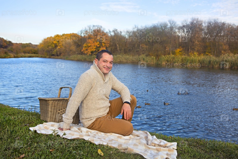 Счастливый молодой человек у озера на открытом воздухе в осенний день