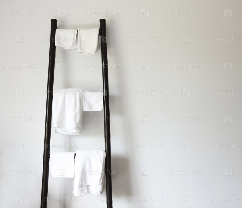 Белые полотенца висят на деревенской деревянной лестнице