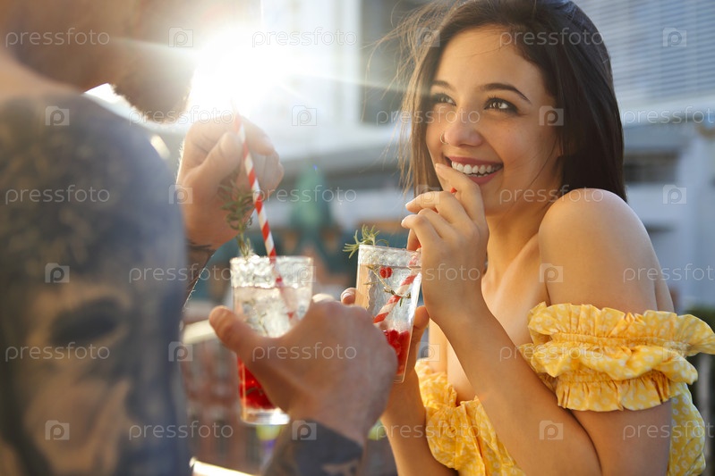 Влюбленная пара пьет летний освежающий лимонад с малиной на балконе
